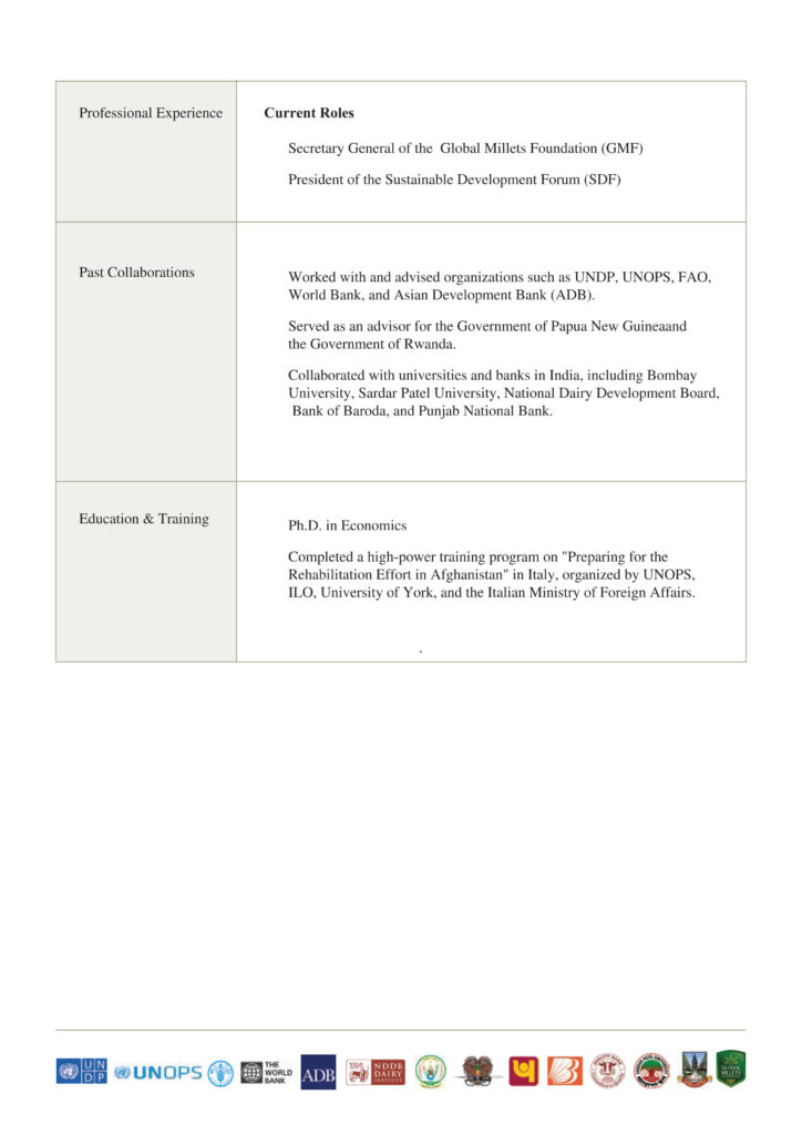Organisations worked with: Bombay University, Sardar Patel University, National Dairy Dev Board, Bank of Baroda, Punjab National Bank; Asian Development Bank, Govt of Papua New Guinea as advisor; UNDP, UNOPS, FAO, World Bank.